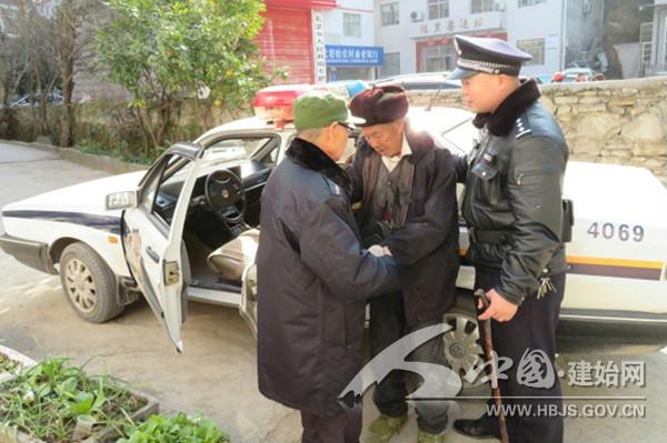 民警将老人扶上警车休息