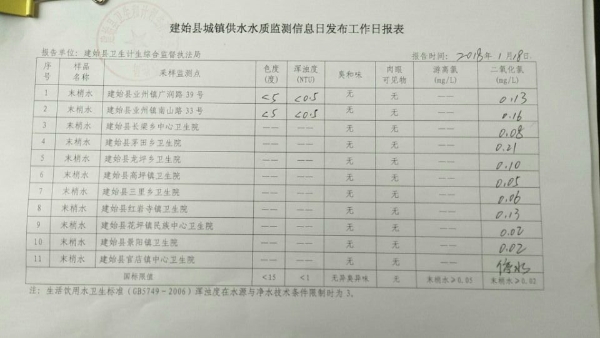 2018年1月18日建始县城镇生活饮用水监测结果公布