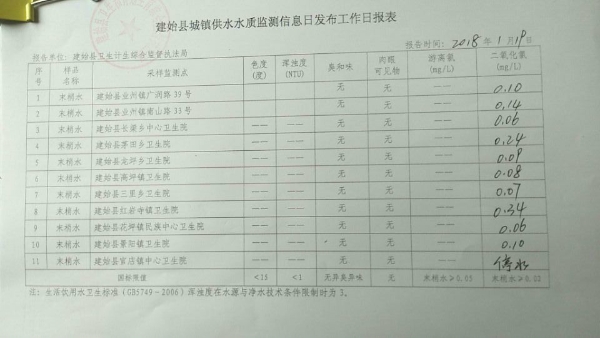 2018年1月19日建始县城镇生活饮用水监测结果公布