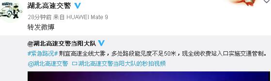 #紧急路况#荆宜高速全线大雾,多处路段能见度不足50米,现全线收费站入口实施交通管制。