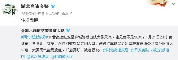 1月22日晨,@湖北高速交警微博发文,湖北境内多条高速入口因大雾天气实施交通管制。