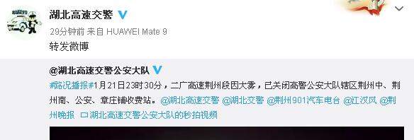 #路况播报#1月21日23时30分,二广高速荆州段因大雾,已关闭高警公安大队辖区荆州中、荆州南、公安、章庄铺收费站。